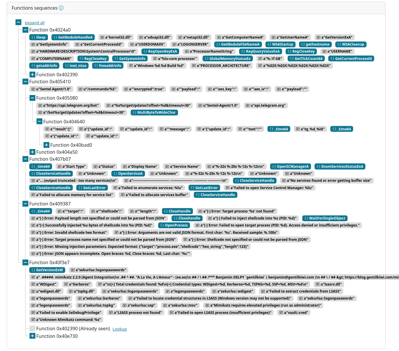 This provides an overview (albeit partial) of the malware capabilities, which enables us to get a basic understanding of the sample capabilities without having to manually reverse it.